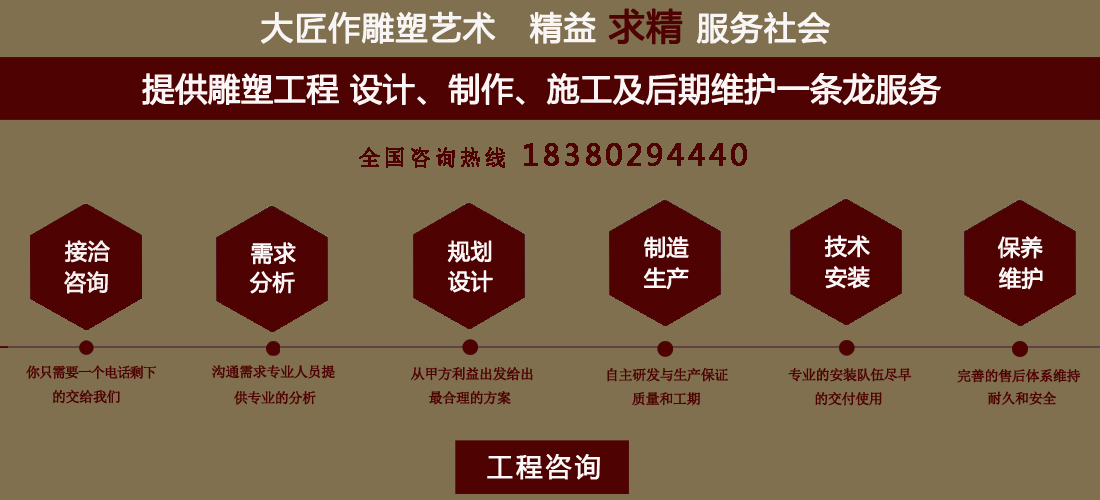 成都大匠作雕塑有限公司,是經(jīng)成都工商局審定注冊的正規(guī)專業(yè)雕塑制作及工程安裝服務(wù)機構(gòu),是由一群年輕富有朝氣的年輕人創(chuàng)辦,發(fā)軔于四川省成都市龍泉驛區(qū)。它是一家******于創(chuàng)作、制作和銷售為一體的公司。大匠作擁有多年從事公共藝術(shù)的專業(yè)人員和雕塑制作人組成的核心團隊,為您提供專業(yè)、具創(chuàng)新的設(shè)計及制作服務(wù)。公司成立以來,秉承“******服務(wù)、誠信為本”的宗旨,以客戶需求為目標(biāo)導(dǎo)向,不斷學(xué)習(xí),進取,優(yōu)化和提高服務(wù)質(zhì)量,公司向您******——“您的滿意***是我們的信譽”,我們將以飽滿的熱情和******的服務(wù)贏得您的贊譽和支持。